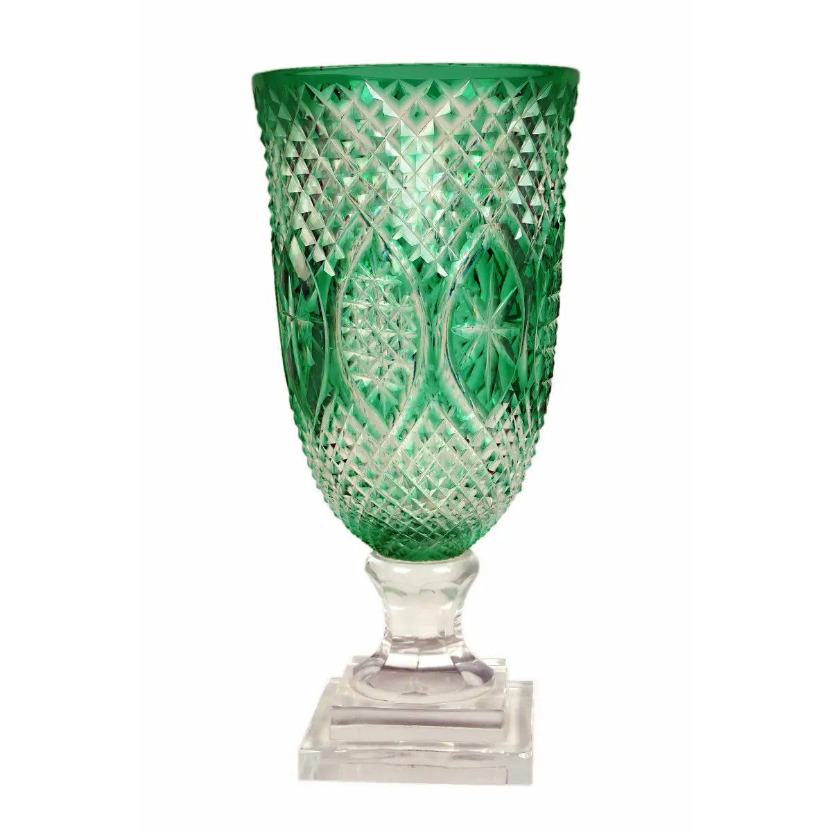 Bring refined elegance to your décor with this Emerald Cut Crystal Pedestal Vase. Expertly crafted with intricate diamond and oval cut patterns, this stunning green vase beautifully captures and reflects light. The elevated pedestal base adds a royal touch, making it perfect for floral arrangements or as a standalone decorative centerpiece. Its rich emerald hue and timeless design complement both classic and contemporary interiors.